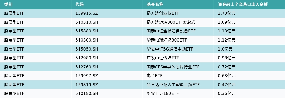 7月14日,股票型ETF资金流入最多的3支ETF及其流入金额分别为:易方达创业板ETF(流入2.73亿元)、易方达沪深300ETF发起式(流入1.69亿元)、国泰中证全指通信设备ETF(流入1.13亿元)。资金流入前10详情见下表: