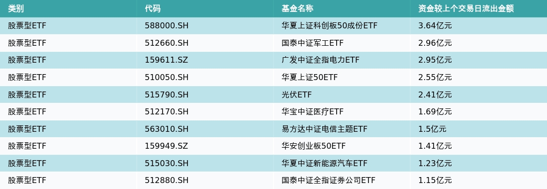 7月14日,股票型ETF资金流出最多的3支ETF及其流入金额分别为:华夏上证科创板50成份ETF(流出3.64亿元)、国泰中证军工ETF(流出2.96亿元)、广发中证全指电力ETF(流出2.95亿元)。资金流出前10详情见下表: