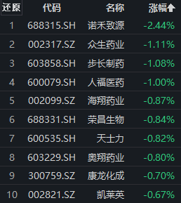 A股医药板块今日早盘跌多涨少。相关指数中,中证创新药产业指数(931152)小幅走低,成分股多数下跌。截至发稿,成分股下跌个股中,诺禾致源跌超2%,众生药业、步长制药跌逾1%;上涨个股中,海思科、神州细胞涨超1%。