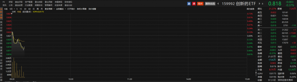 跟踪该指数的ETF中规模最大的创新药ETF(159992)早盘下跌,但盘中溢价交易。截至发稿,跌幅为0.37%,溢折率为0.06%。