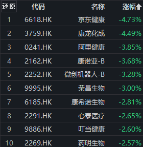 港股方面,今日恢复交易的医疗医药股同样跌多涨少。相关指数中,中证港股通医药卫生综合指数 (930965) 盘中一度跌超2%。截至发稿,京东健康、康龙化成跌超4%,阿里健康、康诺亚-B、微创机器人-B跌逾3%。