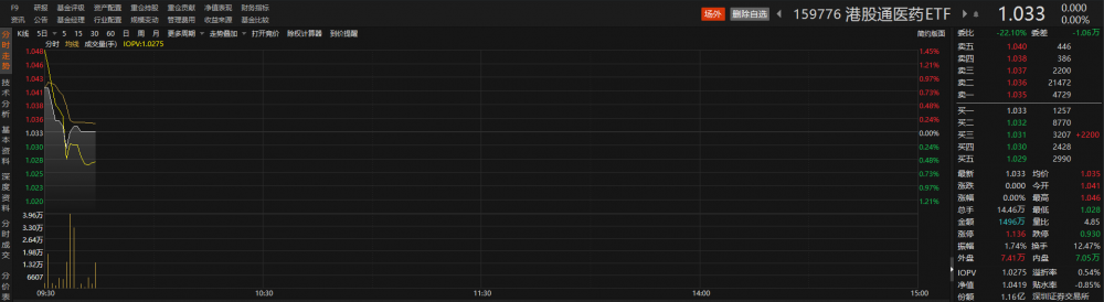跟踪该指数的港股通医药ETF(159776)盘中震荡整理,截至发稿,价格持平,盘中现溢价交易,溢折率为0.54%。