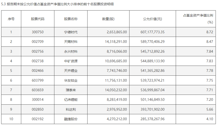二季度,国投瑞银新能源混合重仓持有宁德时代、天赐材料、永兴材料、中矿资源、天齐锂业、华友钴业、璞泰来、亿纬锂能、科达利、融捷股份。