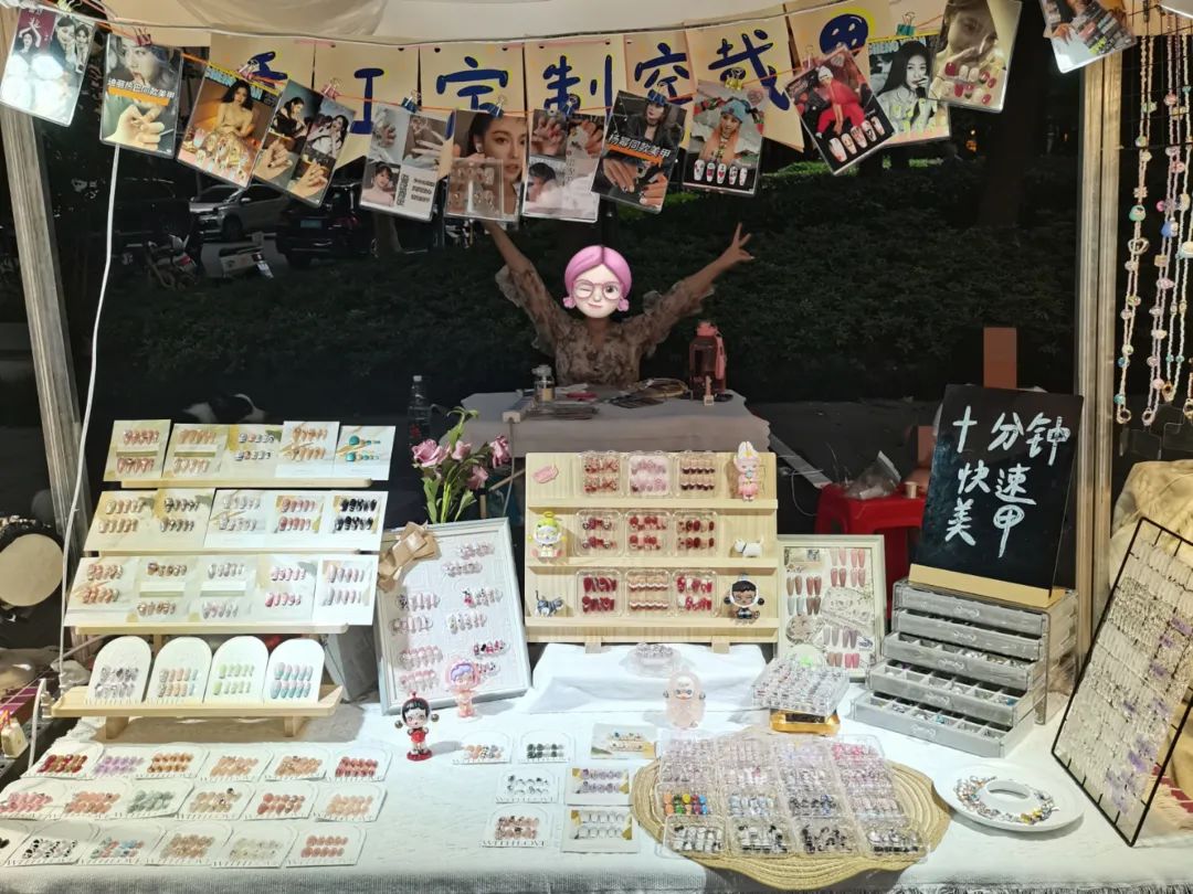 今年5月,从公司离职后的皮皮霍抱着“找点事情做”的想法,和好友一起在武汉开始了摆摊售卖穿戴甲的日子。后来,她偶然在社交平台上看到了招募市集摊主的消息,于是便开始尝试到市集上摆摊。
