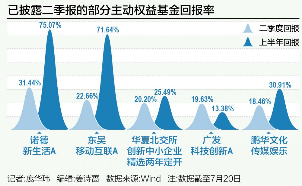 上半年业绩涨幅前5的主动权益基金分别是:诺德新生活A(涨幅75.07%)、东吴移动互联A(涨幅71.64%)、东吴新趋势价值线(涨幅66.41%)、银华体育文化A(涨幅64.21%)和招商优势企业A(涨幅57.55%)。