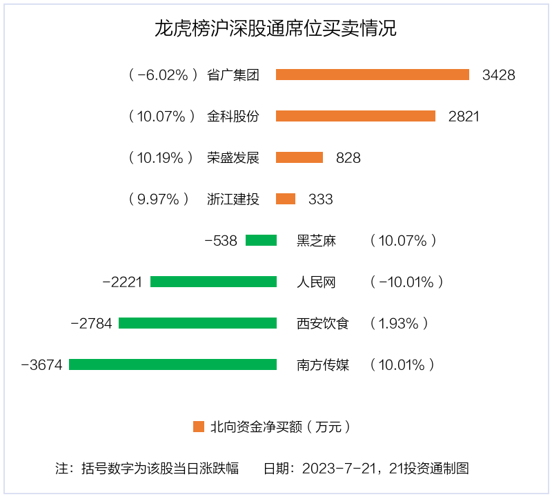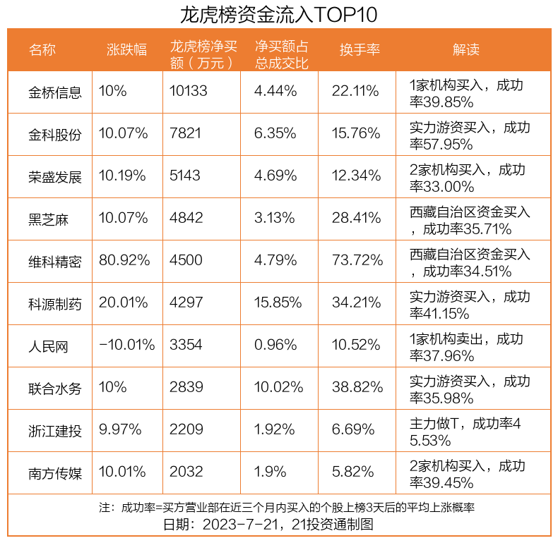 7月21日,上证指数下跌0.06%,深证成指下跌0.06%,创业板指上涨0.35%。盘后龙虎榜数据显示,共有39只个股因当日异动登上龙虎榜,资金净流入最多的是金桥信息(603918.SH),达1.01亿元。