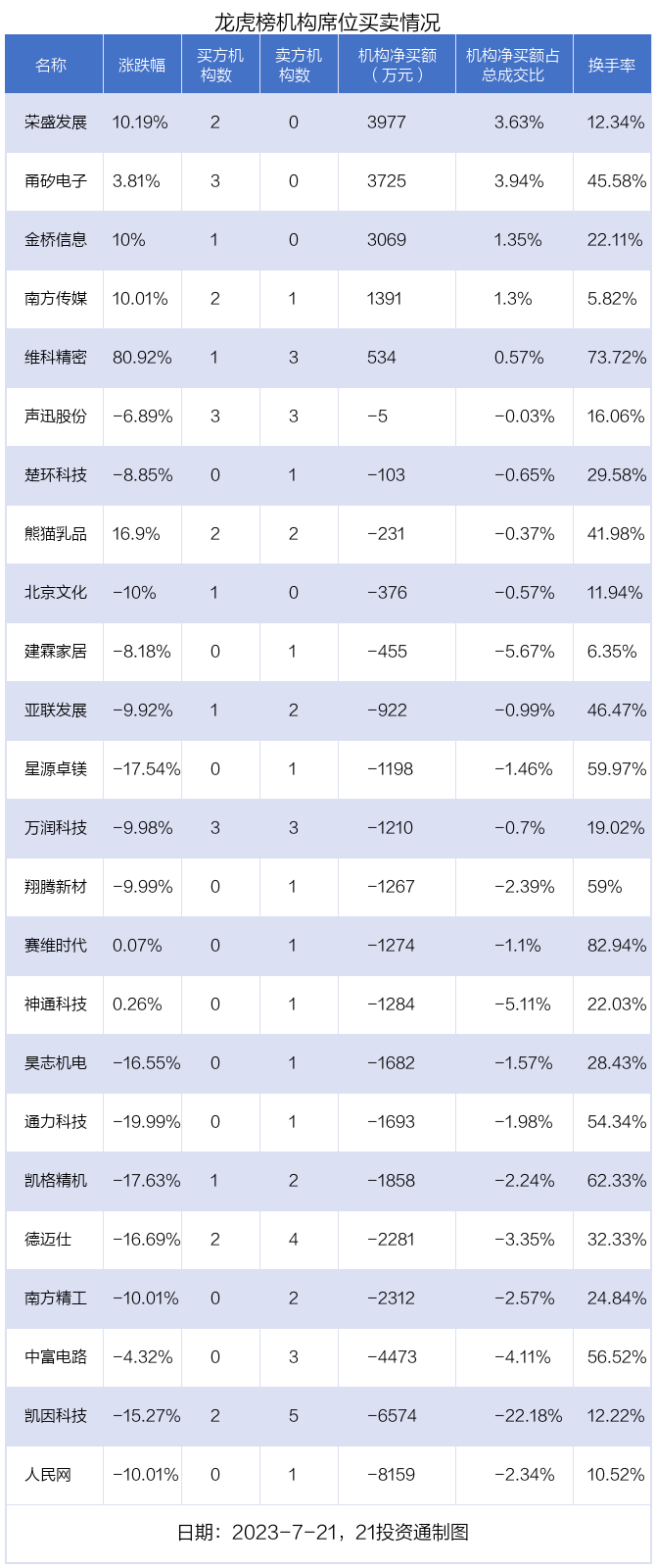 7月21日,24只个股龙虎榜出现了机构的身影,机构合计净卖出2.47亿元。具体来看,机构净买入5股,净卖出19股。