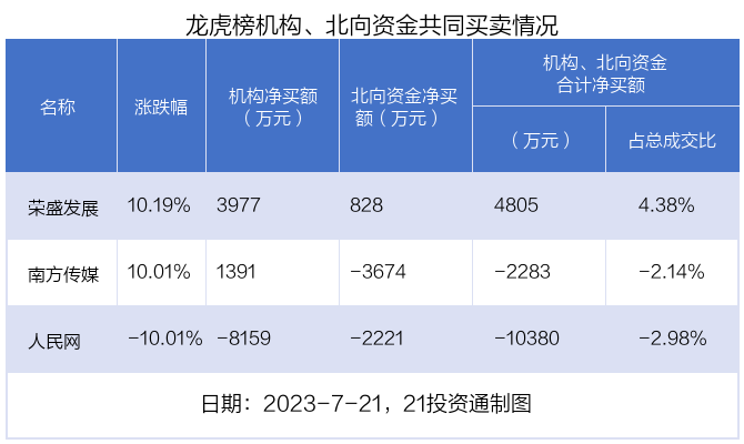 值得注意的是,机构和北向资金共同净买入了荣盛发展等1股;共同净卖出了人民网;在南方传媒上出现分歧,机构净买入南方传媒1391.24万元,北向资金净卖出3674.02万元。