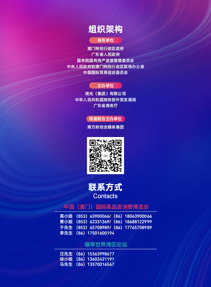 据了解,第二届高品会暨世界湾区论坛将在澳门特别行政区政府、广东省人民政府、国务院国有资产监督管理委员会、中央人民政府驻澳门特别行政区联络办公室、中国国际贸易促进委员会的指导下,由南光(集团)有限公司、商务部外贸发展局、广东省商务厅联合举办。
