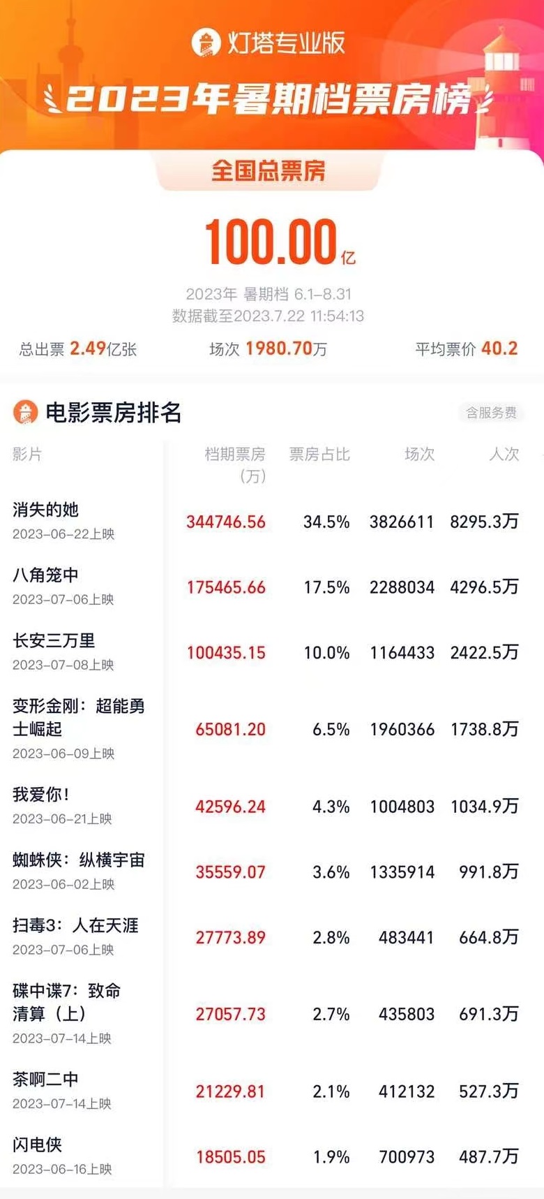据灯塔专业版实时数据,截至7月22日11时54分,2023年暑期档(6月1日-8月31日)总票房(含预售)突破100亿,《消失的她》《八角笼中》《长安三万里》暂列暑期档票房榜前三名。