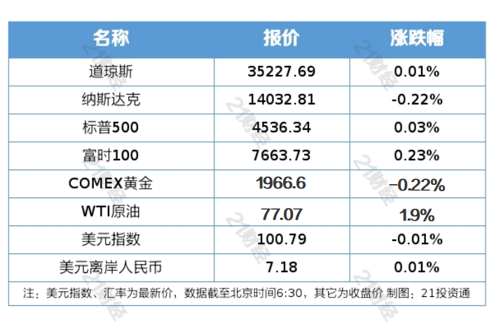 1、美股三大指数收盘涨跌不一,道指涨0.01%,本周累计上涨2.08%;纳指跌0.22%,本周累计下跌0.57%;标普500指数涨0.03%,本周累计上涨0.69%。热门中概股涨跌不一,纳斯达克中国金龙指数涨0.22%,本周累跌3.19%。