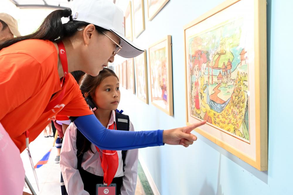 △2023年5月24日,乘坐中老铁路国际旅客列车的百名老挝学生抵达中国云南西双版纳,和中国学生开展联谊活动。图为志愿者向老挝学生讲解允景洪小学内展出的学生画作。