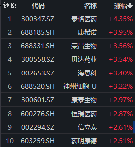 A股医药股早盘多数走高。相关指数中,中证创新药产业指数(931152)盘中拉升,成分股涨多跌少。截至发稿,泰格医药涨超4%,康希诺、荣昌生物、贝达药业、海思科、神州细胞-U涨逾3%。