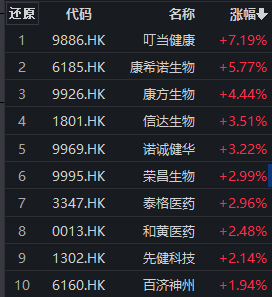 港股方面,医疗医药股同样涨多跌少。相关指数中,中证港股通医药卫生综合指数 (930965) 涨超1%。截至发稿,上涨个股中,叮当健康涨超7%,康希诺生物涨近6%,康方生物涨超4%,信达生物、诺诚健华涨超3%,荣昌生物、泰格医药、和黄医药、先健科技涨逾2%。