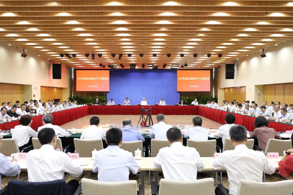 7月24日至25日,中国证监会召开2023年系统年中工作座谈会。会议以习近平新时代中国特色社会主义思想为指导,认真学习贯彻中央政治局会议精神,落实党中央、国务院决策部署,总结工作,分析形势,研究部署下半年重点工作。证监会党委书记、主席易会满作题为《坚定信心 稳中求进 奋力推进中国特色现代资本市场建设》的工作报告。证监会党委委员、副主席李超主持会议。中央主题教育第三十三指导组副组长卢希,证监会党委委员、副主席方星海,党委委员、中央纪委国家监委驻证监会纪检监察组组长樊大志,党委委员、副主席王建军出席会议。