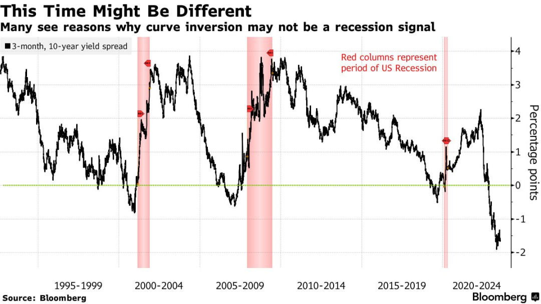 在过去的两周里,这一差距已经扩大到整整一个百分点,接近今年的峰值水平,尽管经济数据基本上强于预期。收益率曲线的其他部分也出现严重倒挂,包括3个月期和10年期美债收益率之差,这是哈维关注的重点。