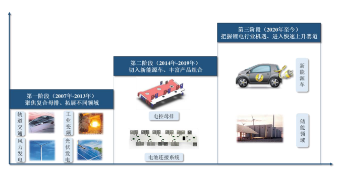 2014 年,他瞄准新能源汽车行业推出电控母排,成为法拉电子、比亚迪的供应商,并开发出热压电池连接系统,进入北汽新能源等的供应链。