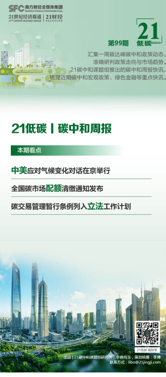 本期看点:中美应对气候变化对话在京举行;全国碳市场配额清缴通知发布:差异化开展配额分配;碳交易管理暂行条例列入立法工作计划;2030年前全国碳市场碳价或达130元/吨。