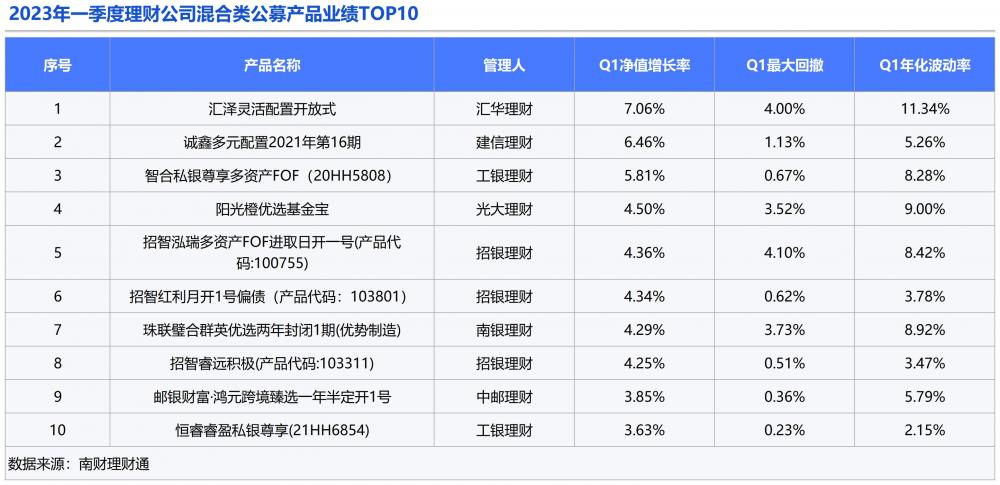 南财理财通数据显示,理财公司混合类公募产品一季度收益榜单出炉,共有7家理财公司产品上榜。其中,招银理财有3只产品上榜,工银理财有2只产品上榜,汇华理财、建信理财、光大理财、南银理财和中邮理财各有一只产品上榜。汇华理财“汇泽灵活配置开放式混合类理财产品”以7.06%的一季度净值增长率摘得本次混合类理财产品一季度收益率榜单冠军。同时,截至2023年一季度末,该产品累计收益率为26.11%。