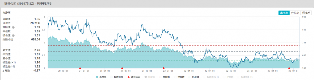 当前,中证全指证券公司指数整体市净率估值为1.36倍,处于近三年28.71%的分位点。