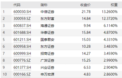 中证全指证券公司指数选取中证全指样本股中至多50只证券公司行业股票组成,以反映该行业股票的整体表现。前十大权重股包括中信证券、东方财富、海通证券、华泰证券、东方证券、招商证券等公司。