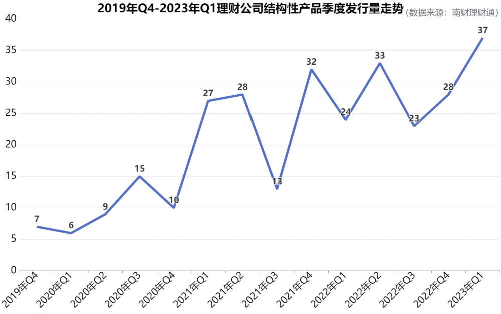 从发行趋势来看,在2019年Q4至2023年Q1期间,伴随理财公司纷纷入局结构性产品市场,结构性产品发行量整体呈加速之势,单季发行量由2019年Q4的7只增长至2023年Q1的37只,同时2023年Q1的发行量是自理财公司发行首只结构性产品以来的最高点。