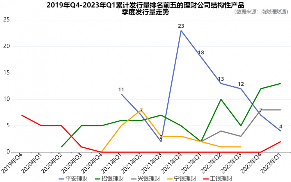 从累计发行量排名前五的理财公司来看,自发行首只结构性产品以来,招银理财和兴银理财一直保持平稳的发行走势;而宁银理财和平安理财的发行动能则有所减弱,二者单季发行量先后于2021年Q2和2021年Q4触顶,此后便一直呈下滑走势;工银理财在停发结构性产品九个月后,于2023年3月重启该类产品的发行,推出了全新的结构性产品系列“鑫悦自动触发”。