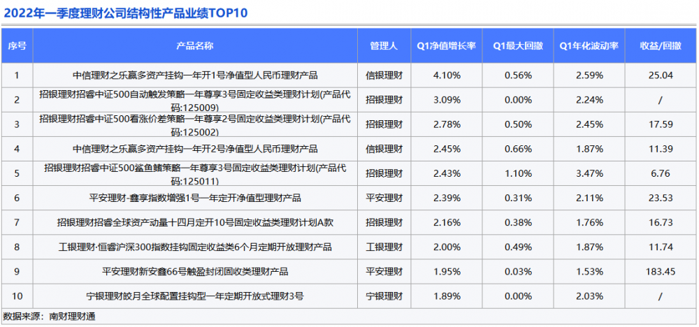 从收益指标“近3月净值增长率”来看,排名前三的产品分别是信银理财的“乐赢多资产挂钩一年开1号”,招银理财的“招睿中证500自动触发策略一年尊享3号”以及 “招睿中证500看涨价差策略一年尊享2号”,上述三只产品一季度近3月净值涨幅依次为4.10%、3.09%和2.78%。