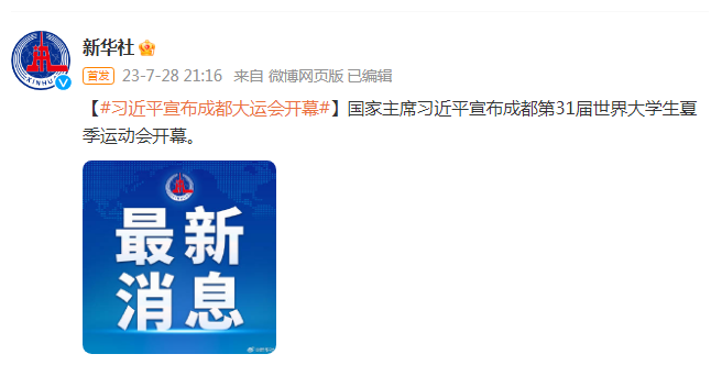 国家主席习近平宣布成都第31届世界大学生夏季运动会开幕。