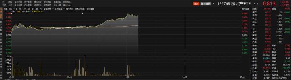 场内唯一跟踪中证内地地产主题指数的ETF——房地产ETF(159768)午后涨幅扩大至近4%,该ETF交投持续活跃,截至发稿,成交额超6400万元,换手率高达16.93%。