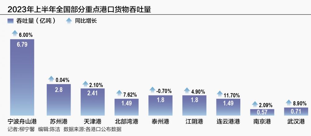 今年上半年,山东港口完成货物吞吐量同比增长7.7%,集装箱量同比增长11.4%,继续保持向好态势,其中,商品车吞吐量同比增长45.6%,作为中国北方商品车中转枢纽港的烟台港在汽车运输量上持续增长。同期,江苏港口完成货物吞吐量16.5亿吨,同比增长6.0%,完成外贸货物吞吐量3.0亿吨,同比增长13.9%,也在拓展风电整机设备出口、新能源汽车出口等新业务。
