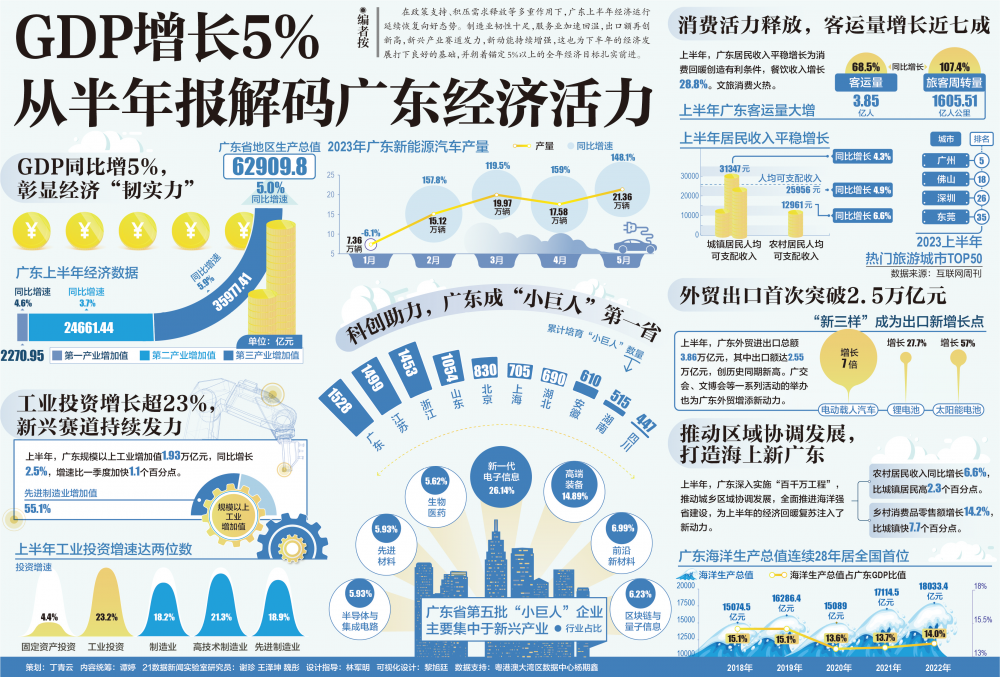 在政策支持、积压需求释放等多重作用下,广东上半年经济运行延续恢复向好态势。制造业韧性十足,服务业加速回温,出口额再创新高,新兴产业赛道发力,新动能持续增强,这也为下半年的经济发展打下良好的基础,并朝着锚定5%以上的全年经济目标扎实前进。