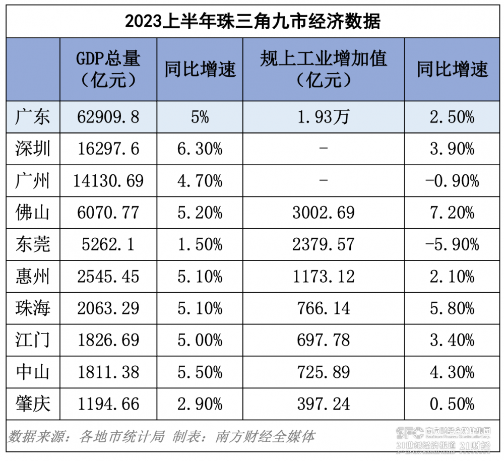 南方财经全媒体记者梳理发现,珠三角九市上半年GDP合计超过5.12万亿元,占全省比重超过八成。深圳仍是广东经济总量第一大市,上半年GDP突破了1.6万亿元,广州则紧随其后,上半年GDP突破1.4万亿元。
