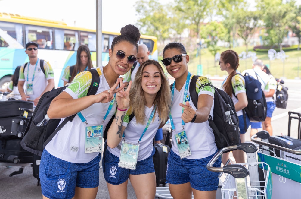 7月22日,巴西代表团成员抵达成都大运村后合影。新华社记者 黄伟 摄