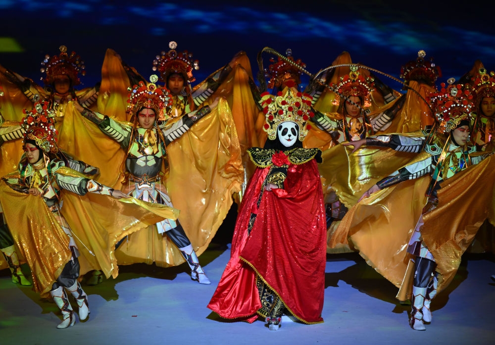 开幕式上,青年大学生与憨态可掬的友谊使者大熊猫欢快起舞,在象征“团结”的U型会徽下参赛国家地区的旗帜汇聚连接。