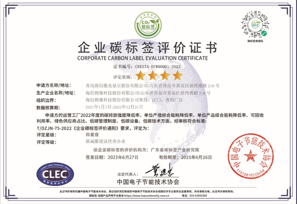 中国电子节能技术协会依据国内第一个以企业性质为主导的碳标签评价团体标准《企业碳标签评价通则》(T/DZJN 75—2022),从企业碳排放强度降低率、单位产值综合能耗降低率、单位产品综合能耗降低率、可回收利用率、绿色供应商占比、低碳管理制度、低碳设备、低碳技术等方面,对企业进行定性和定量的综合评价,为海信激光显示股份有限公司颁发全国首个企业碳标签证书。