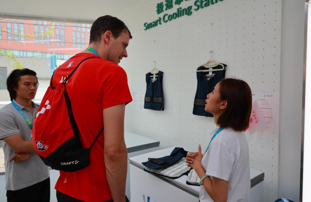 在大运村,能享受这些科技产品的群体,不仅有运动员,“当穿上冰背心的那一刻,我觉得自己是夏天里最冷酷的仔”,志愿者梁欢对21世纪经济报道记者说道。