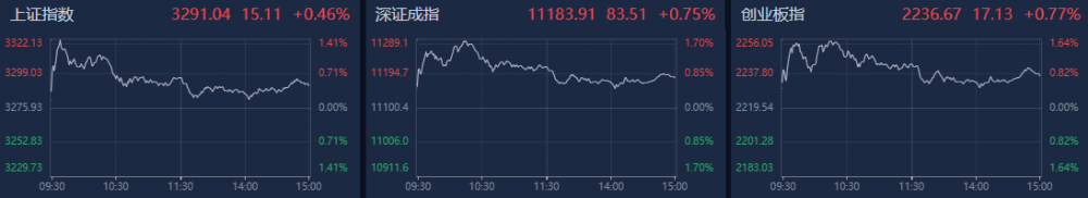 A股三大指数全天冲高回落。南财金融终端显示,截至收盘,上证指数涨0.46%,报收3291.04点;深证成指涨0.75%,报收11183.91点;创业板指涨0.77%,报收2236.67点。