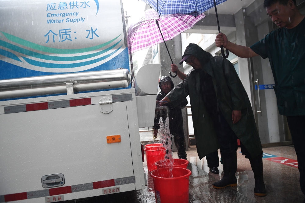 位于门头沟区永定镇的上岸疗养院31日中午停水,之后工作人员在雨中迎来了应急供水车,并组织看护人员集中取水。北京市自来水集团介绍,该集团门头沟城子水厂挡水墙被冲垮,配水机房进水导致全厂停水,影响门头沟区门城等地区约15万户正常供水。目前有45辆应急供水车向停水地区进行应急供水,优先前往养老院、医院等地。