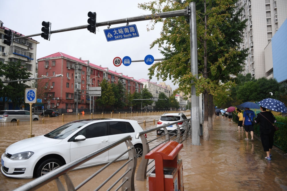 7月31日,在门头沟区大峪南路,行人从积水的路面和泡水的车辆旁走过。新华社记者 鞠焕宗 摄