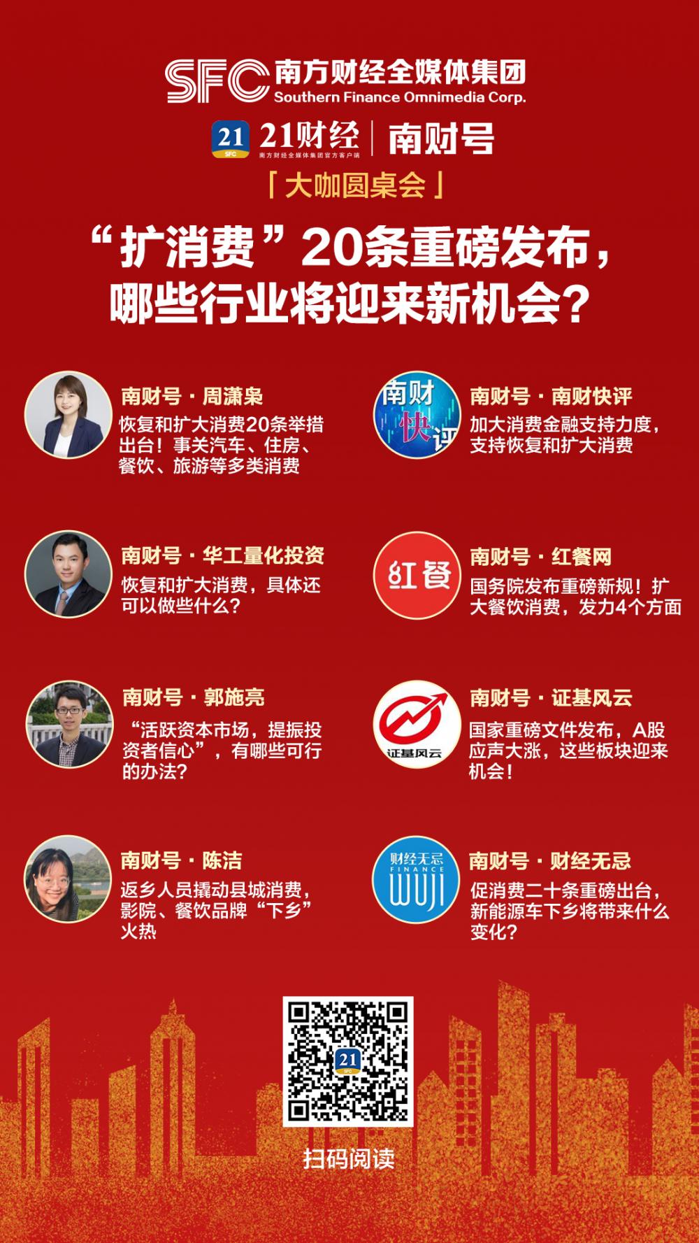 国家发展改革委发布《关于恢复和扩大消费措施》,围绕6个方面提出20条具体政策举措。“恢复和扩大消费20条”对消费行业意味着什么?当前,我国消费行业呈现出哪些特点和趋势?重磅利好之下,展望下半年,消费行业的哪些细分类目将迎来新机会?南财号《大咖圆桌会》为您解读:点击阅读专题>>