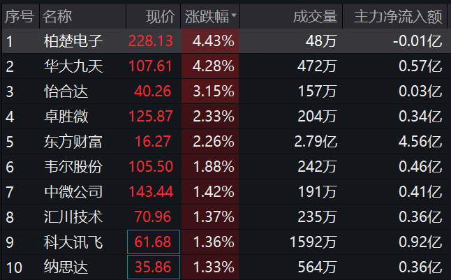 涨幅方面,柏楚电子、华大九天涨超4%,怡合达涨超3%,卓胜微、东方财富、韦尔股份、中微公司等跟涨。跌幅方面,复旦微电跌超2%,澜起科技、朗新科技、华润微等股下跌。