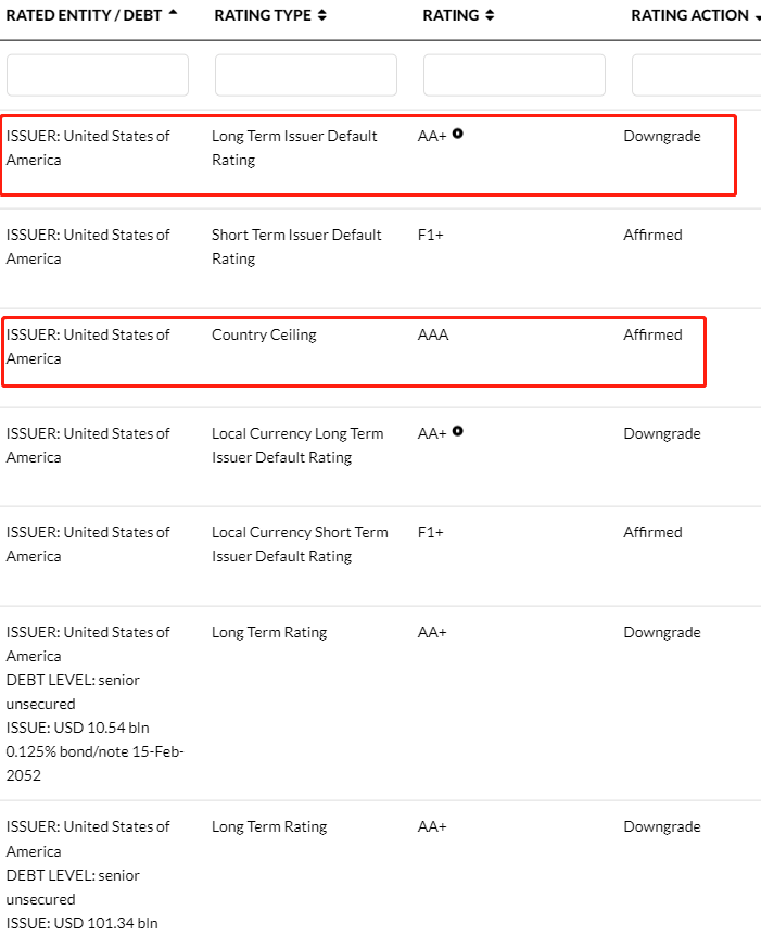 8月1日周二,三大评级机构之一的惠誉将美国长期外币债务评级从AAA下调至AA+,展望从负面转为稳定。此次是惠誉自1994年首次发布美国信用评级以来第一次对该国的评级下调。