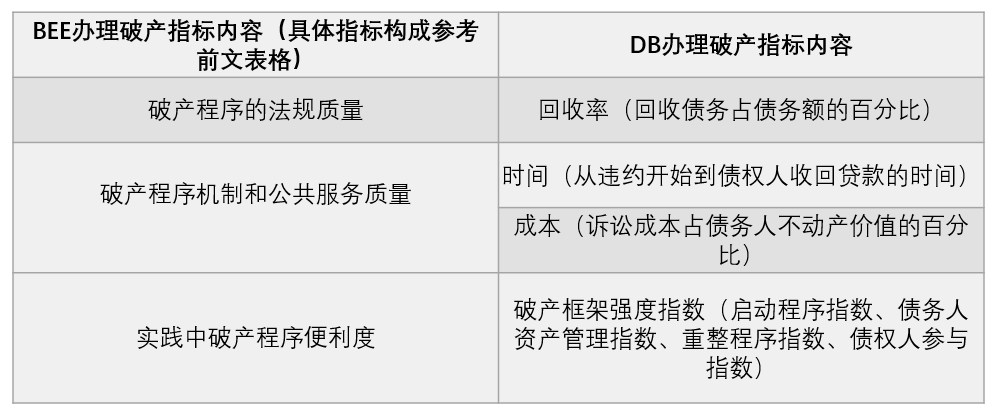 此外,原DB“办理破产”指标侧重于企业的成本效率,而BEE的“办理破产”指标还增加了社会效益的评估,以确保破产程序的透明度、公平性和法律确定性。