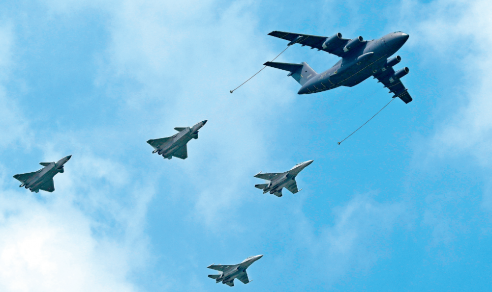 在2023年空军航空开放活动·长春航空展上,运油-20单机和歼-20双机、歼-16双机加油编队进行飞行展示(2023年7月26日摄)余红春摄/《瞭望》