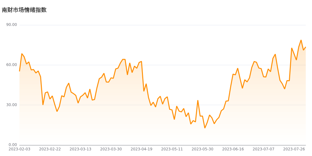 今日南财市场情绪指数为73.6,较前一交易日71.1上涨,市场投资热度提升。