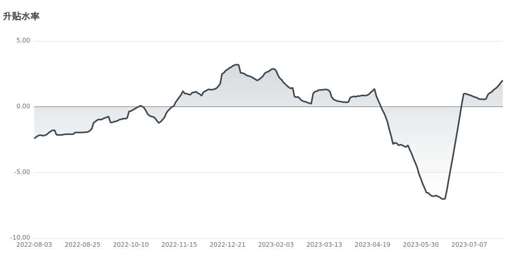 今日该指标值为2.00%,目前该指标处于近一年较高区间,说明投资者认为当前A股市场相对较强。反映期货市场投资者对市场的看法,该指标越高说明投资者认为当前市场较强,越低则说明认为市场相对较弱,因而与上证指数正相关。
