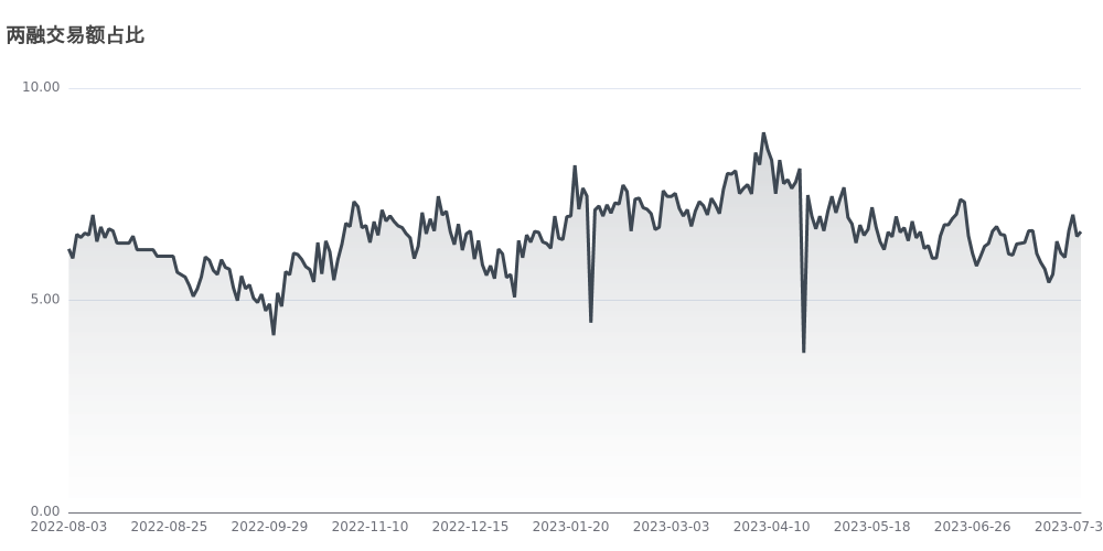 今日该指标值为6.62%,目前该指标处于近一年中立区间,说明投资者对A股持中立情绪。反映场内投资者借钱炒股的杠杆水平,该指标越高说明杠杆水平越高,即投资者认为当前市场较强,反之则说明投资者认为市场相对较弱,因而与上证指数存在较强的正相关性。