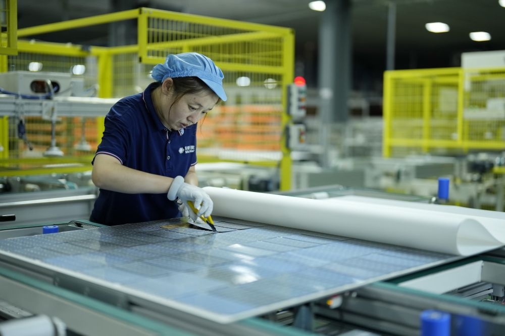 2023年3月18日,河北省玉田县一家光伏设备生产企业的工人在车间内工作。新华社记者 牟宇 摄