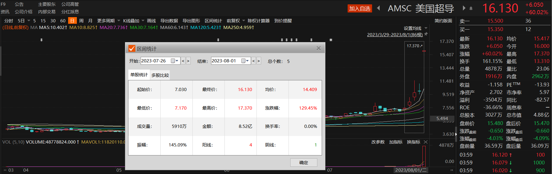 8月1日美股开盘后,美国超导股价飙升,盘前一度大涨超140%,截至收盘涨幅超过60%。在近5个交易日内,该股累计涨幅已近130%。